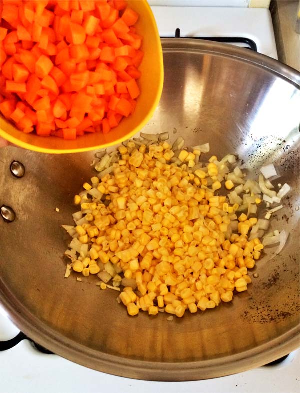 Cuando este listo el aceite saltear a fuego lento cebolla picada y ajo con el elote y zanahoria.* si estas usando jalapeño incorporar este también.