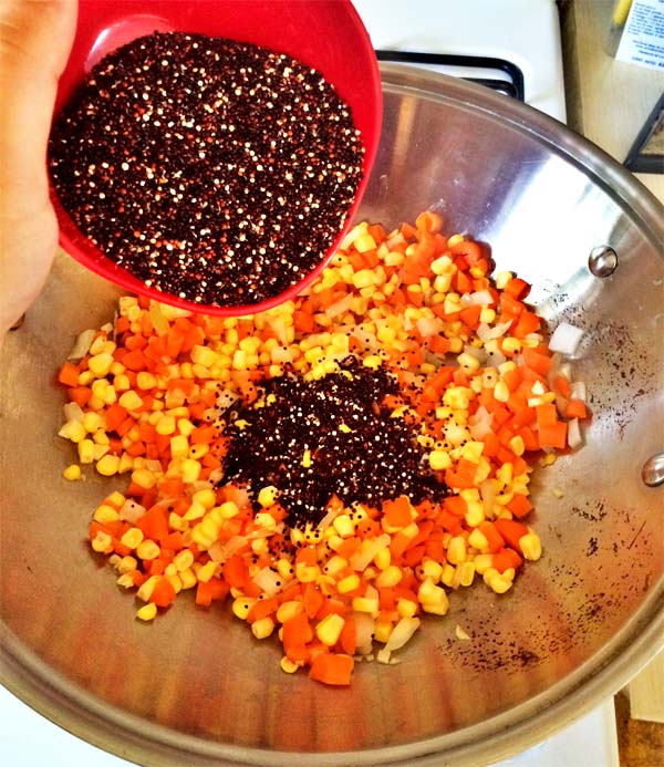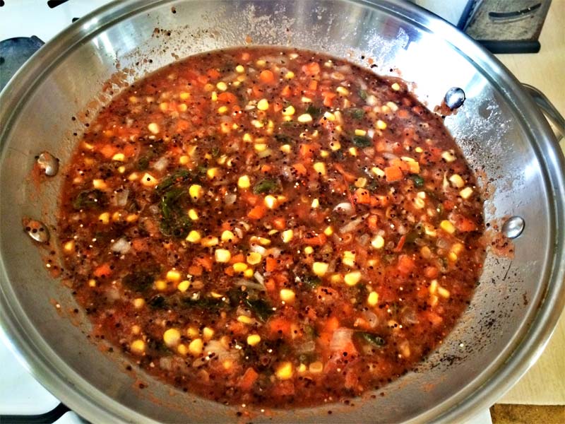 Saltear por un minuto e incorporar la quinoa cruda, y el puré de jitomate, debe de esta bastante caldoso para que se cocine bien la quinoa.