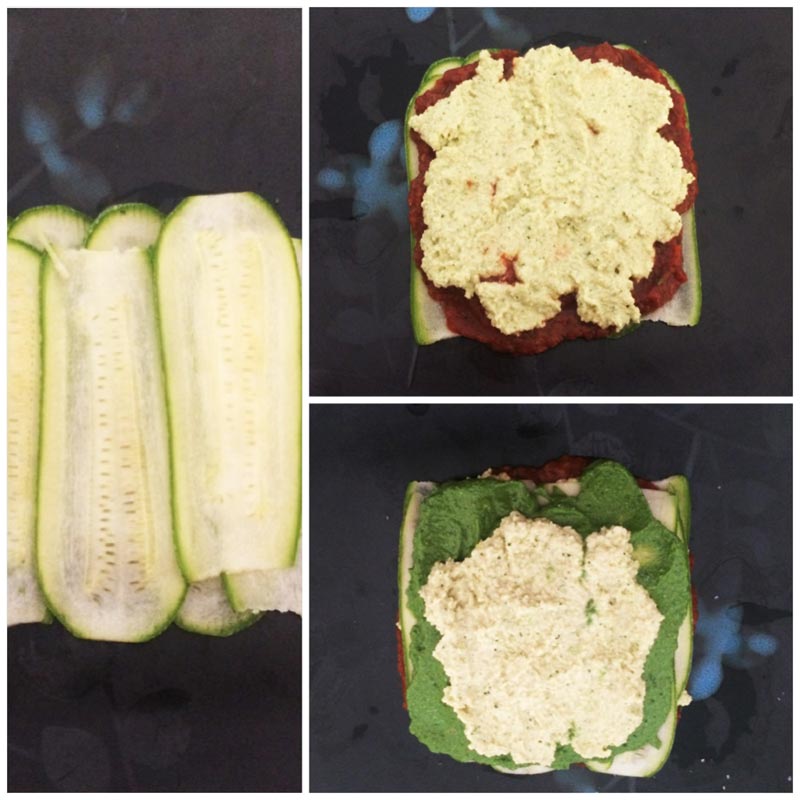 En un plato plano, poner una primera capa de calabacitas formando un cuadro del tamaño que deseas tu lasagna. Luego seguir con 2 cucharadas de salsa de jitomate y 2 del queso preparado. Finalizada la primera capa, repetir el proceso hasta lograr las capas deseadas. Con 4 es suficiente, terminándose con una capa de calabazas y una cucharada de salsa roja.
